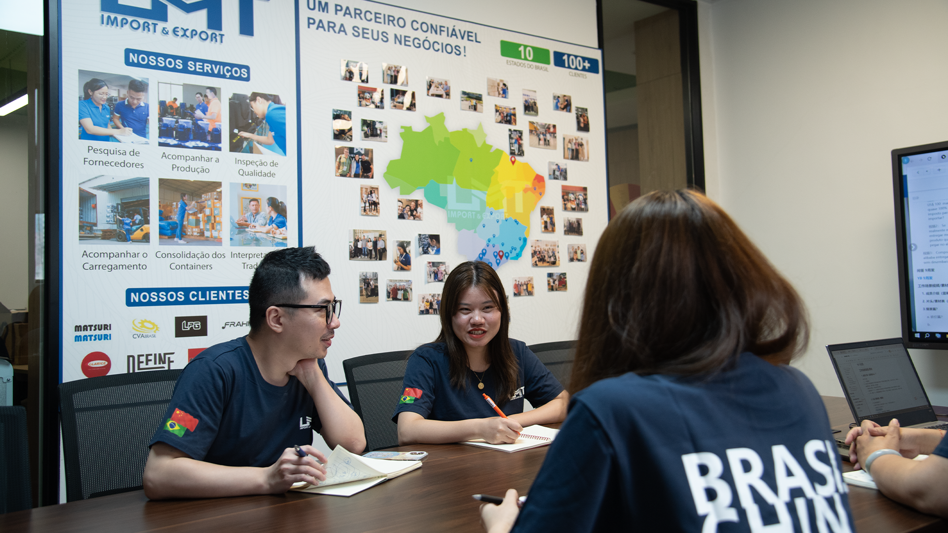 Equipo profesional enfocado en el comercio exterior entre China y Brasil.